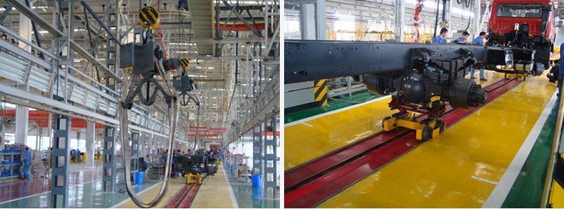 該項(xiàng)目由總裝配線和車身分裝線組成。總裝配線用于整車底盤裝配及檢查下線,它由兩部分組成,前部分采用單鏈牽引小車形式,即可調(diào)臺(tái)車間距垂直返回式地拖鏈,后部分采用雙板鏈形式。總裝線產(chǎn)品上線為起吊設(shè)備吊裝上線,產(chǎn)品下線為駕駛員駕駛產(chǎn)品下線。產(chǎn)品在總裝配線上由兩臺(tái)至四臺(tái)臺(tái)車支撐運(yùn)行,完成駕駛室、輪胎、車廂等的裝配作業(yè)。為了使產(chǎn)品在雙行道板鏈和地拖鏈之間自動(dòng)平滑過渡,在地拖鏈的末端與雙行道板鏈重疊段設(shè)置向下的緩坡。