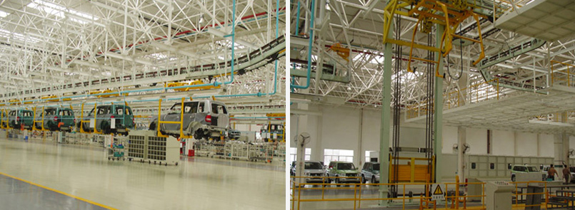 該系統主要由以下三部分組成:漆后車身輸送線、內裝飾線、底盤線。漆后車身輸送線主要用于將涂裝好的車身儲存及轉運,線體采用滑撬輸送機,涂裝車間的旋轉滾床將編組后的漆后車身送入過廊上的雙鏈輸送機。車身在過廊上儲存和輸送,在轉掛滾床上定位,經液壓舉升叉式移栽機將車身轉移到旋轉滾床上,在通過叉式移栽升降機將車身落到內裝飾線的隨動裝置上。內裝飾線采用版式輸送機,從漆后車身輸送線通過隨動裝置接漆后車身,再將內飾后的車身送到底盤線。底盤線包括:底盤裝配線、車門分裝線、車輪分裝線、儀表臺分裝線、前懸分裝線、后懸分裝線、發動機分裝線、座椅分裝線、最終裝配線等。控制系統采用五套分控制系統,系統一控制漆后車身輸送線及內實現轉接升降設備;系統二控制內飾車門線及儀表分裝線;系統三控制底盤、輪胎、座椅線、發動機和前后懸分裝線;系統四控制最終裝配線、車身轉運及OK線;系統五控制外觀檢測線。