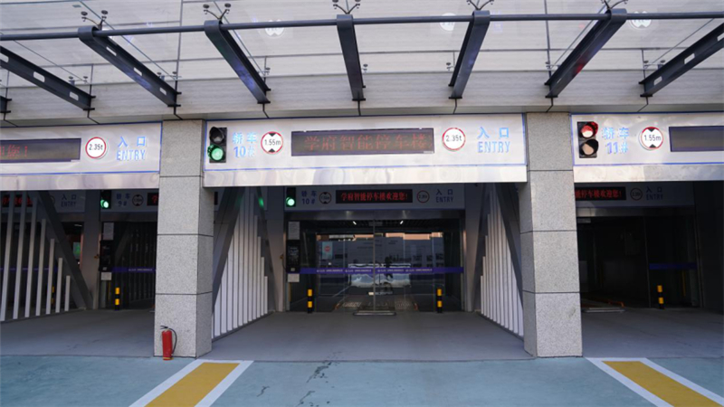 學府智能停車樓位于塢城路與學府街交叉口西北角,該項目建筑面積17908.41平方米,總高度為38.75米,分為南北兩個庫,南庫停車層13層,北庫停車層11層,共計1204個停車位,其中機械停車位918個,室外停車位118個,商務樓地下兩層停車位168個。樓體設置11個相互獨立的進口和出口,實現了獨立連續存取車輛。